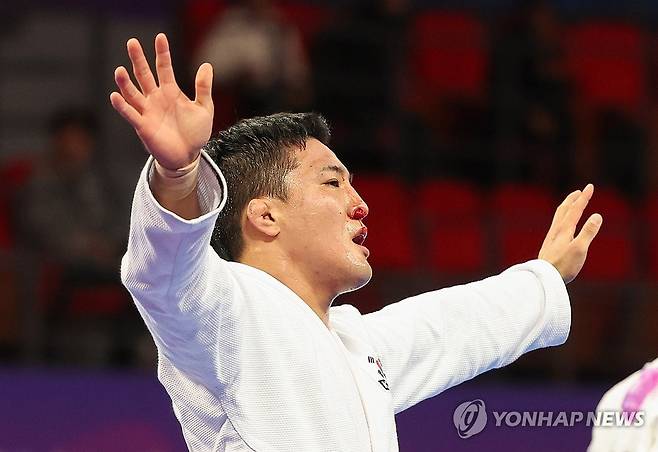 (항저우=연합뉴스) 이지은 기자 = 6일 중국 항저우 샤오산 린푸 체육관에서 열린 항저우 아시안게임 주짓수 남자 77kg급 결승 경기에서 한국 구본철이 바레인 압둘라 문파레디에 승리하며 금메달을 차지한 뒤 환호하고 있다. 2023.10.6
