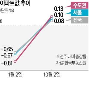 지역별로 살펴보면 서울(0.1%)과 지방(0.03%)은 지난주와 상승률이 같았다. 경기(0.14%→0.16%)와 인천(0.05%→0.07%)의 오름세가 가팔라지며 수도권 상승률이 지난주 0.11%에서 이번주 0.13%로 확대됐다. 서울은 20주 연속 상승 중이다. 한국부동산원 관계자는 “추석 연휴 영향으로 거래 및 매수 문의는 감소했다”면서도 “인기 단지의 매도 희망 가격 수준이 지속적으로 상향 조정되는 모습을 나타내고 있다”고 설명했다.