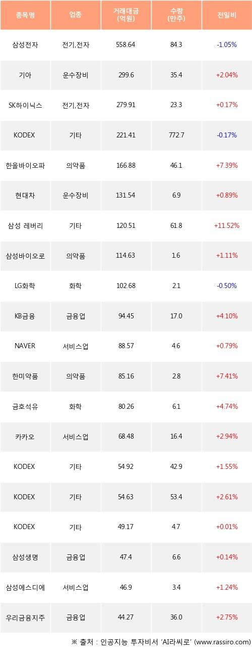 기아, SK하이닉스, 한올바이오파마 등은 전일 대비 주가가 상승했고, 삼성전자, KODEX 200선물인버스2X, LG화학 등은 주가가 하락했다.