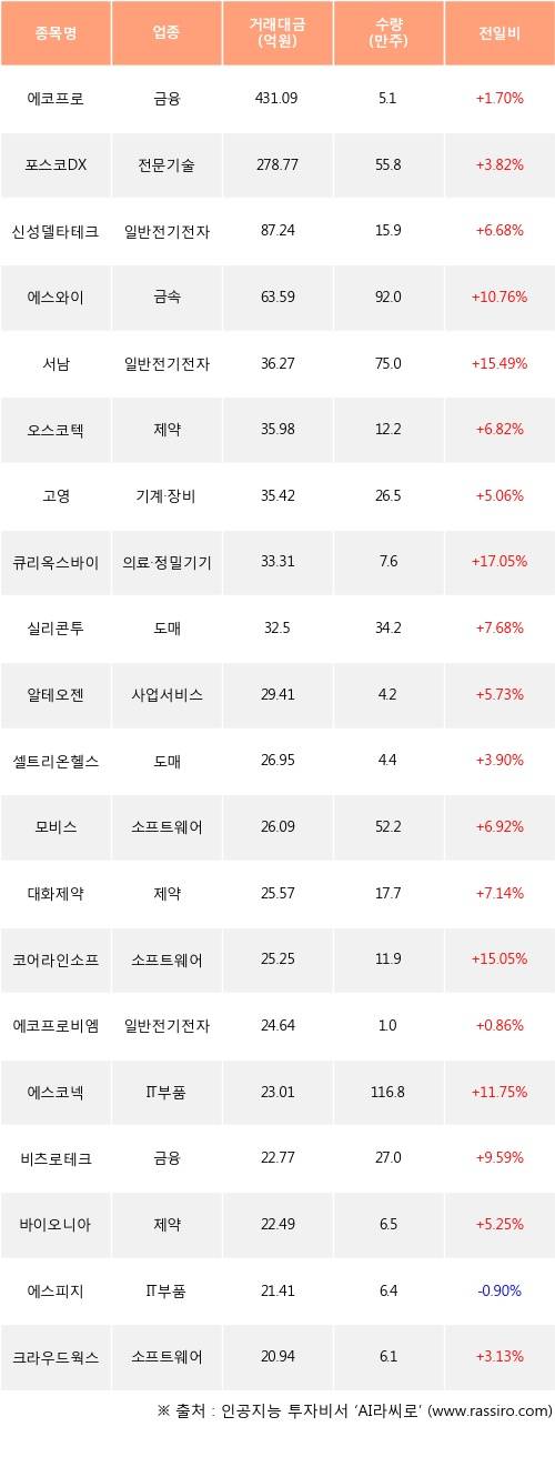 에코프로, 포스코DX, 신성델타테크 등은 전일 대비 주가가 상승했고, 에스피지 등은 주가가 하락했다.