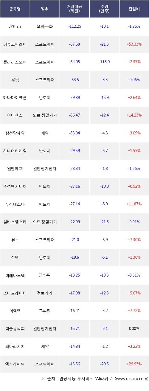 외국인 투자자의 순매도 상위 20개 종목은 JYP Ent., 레뷰코퍼레이션, 폴라리스오피스, 루닛, 하나마이크론, 아이센스, 삼천당제약, 하나머티리얼즈, 엘앤에프, 주성엔지니어링등이다.