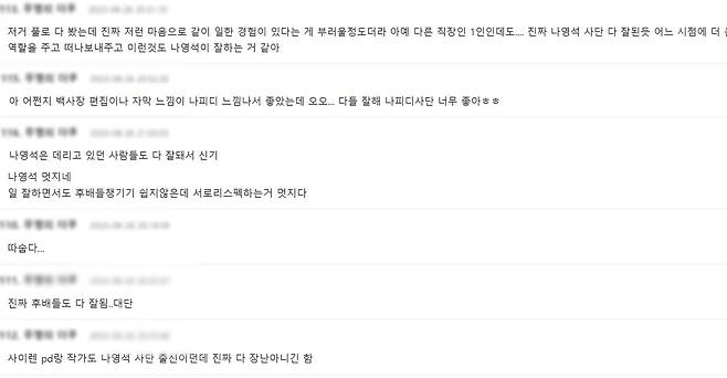 또 후배 양성을 위해 '에그이즈커밍' PD를 공개채용을 진행 중인데 ,이 또한 콘텐츠로 풀며 신선함을 안겼다. 네티즌들은 "나영석 사단 다 잘 된 듯", "저런 선후배 관계 부러울 정도다", "어느 시점에 더 큰 역할을 주고 떠나보내주는 것도 나영석이 잘 하는 것 같다", "나영석이 아끼는 게 보인다", "멋진 리더다" 등의 반응을 보였다.