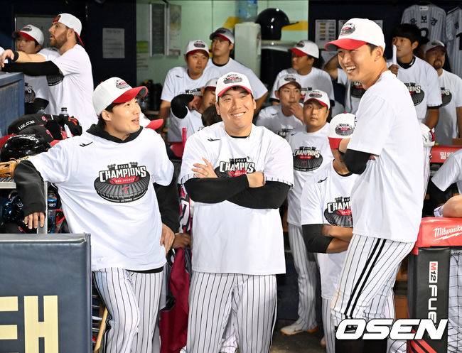 임찬규-김현수-박해민,'우승 기념 영상 보며 활짝' [사진]