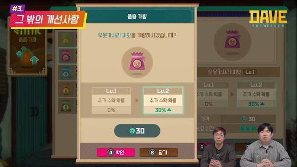 우 디자이너는 "씨앗을 업그레이드 하면 농장에서 키우는 해조류 수확량이 늘어난다. 아울러 많은 유저가 씨앗 상점이랑 농장의 거리가 너무 멀다는 의견도 수렴해 구모 농장에서 직접 씨앗을 판매하는 방식을 택했다. 이에 따라 앞으로는 해당 자리에서 씨앗을 구매하고 심을 수 있다"고 전했다.