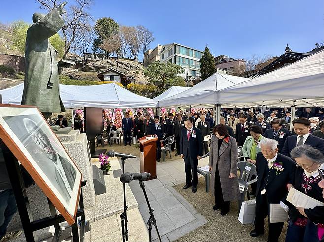 | ▲ 지난 3월 26일 오후 서울 종로구 이화장에서 열린 이승만 전 대통령 탄생 148주년 기념식에서 참석자들이 국기에 대한 경례를 하고 있다. |