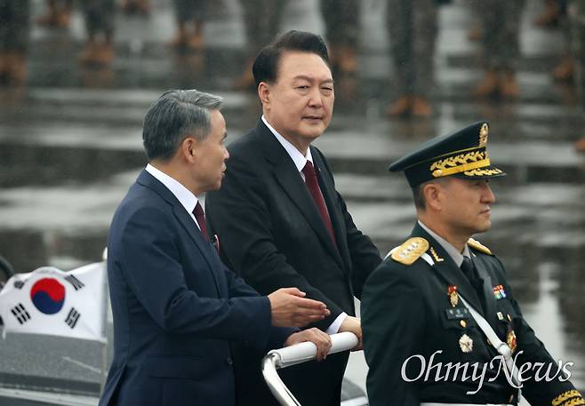 | ▲ 윤석열 대통령이 지난 9월 26일 오전 경기 성남시 서울공항에서 열린 '건군 75주년 국군의 날 기념식'에서 열병하고 있다. |