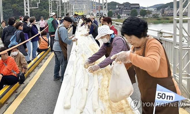 (공주=연합뉴스) '2023 대백제전' 세부 프로그램으로 7일 충남 공주시 금강철교 위에서 열린 '인절미 축제'에서 시민들이 인절미를 만들고 있다. 공주시는 이 축제에서 '단일 장소에서 동시에 만들어진 가장 긴 인절미' 부문 한국기록원 공식 최고 기록을 수립했다고 밝혔다. 2023.10.7 [공주시 제공. 재판매 및 DB 금지]