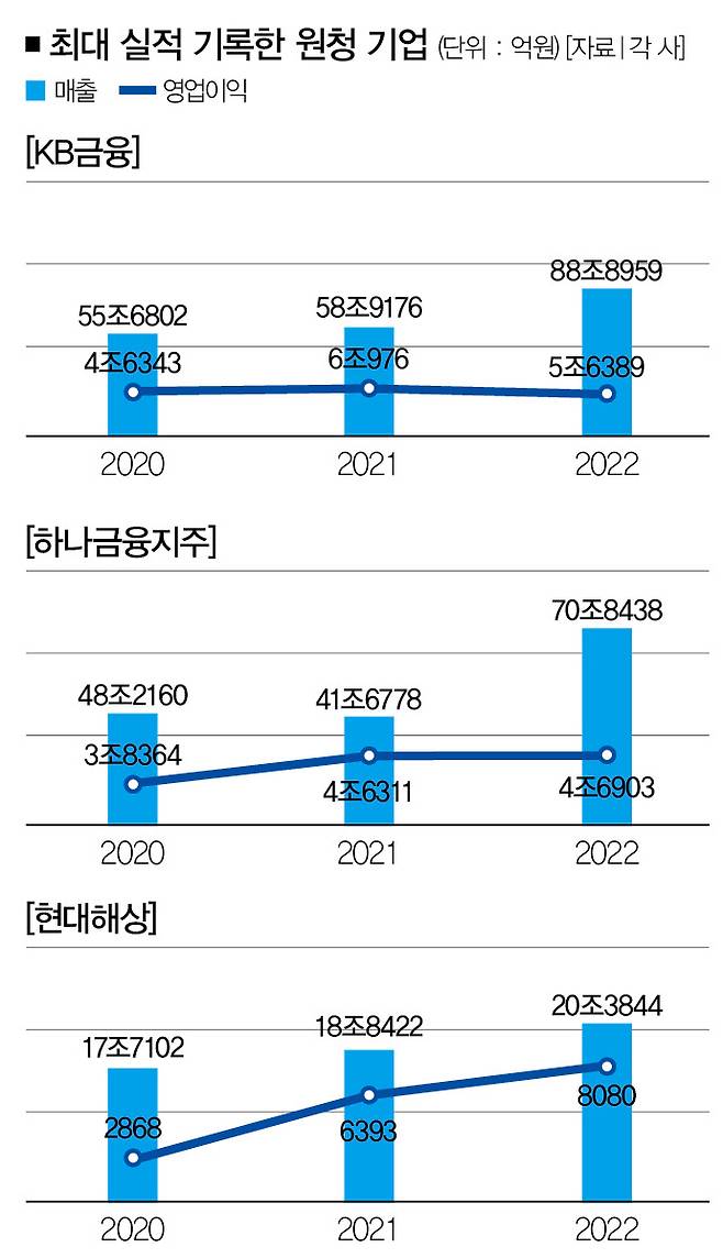 같은 기간 KB국민은행의 영업이익은 소폭 감소했지만, 5조원대를 사수하는 데 성공했다. 하나은행은 1.2% 늘어난 4조6903억원의 영업이익을 올렸다. 현대해상은 매출액과 영업이익이 각각 8.1%(18조8422억원→20조3844억원), 26.3%(6393억원→8080억원) 늘었다.