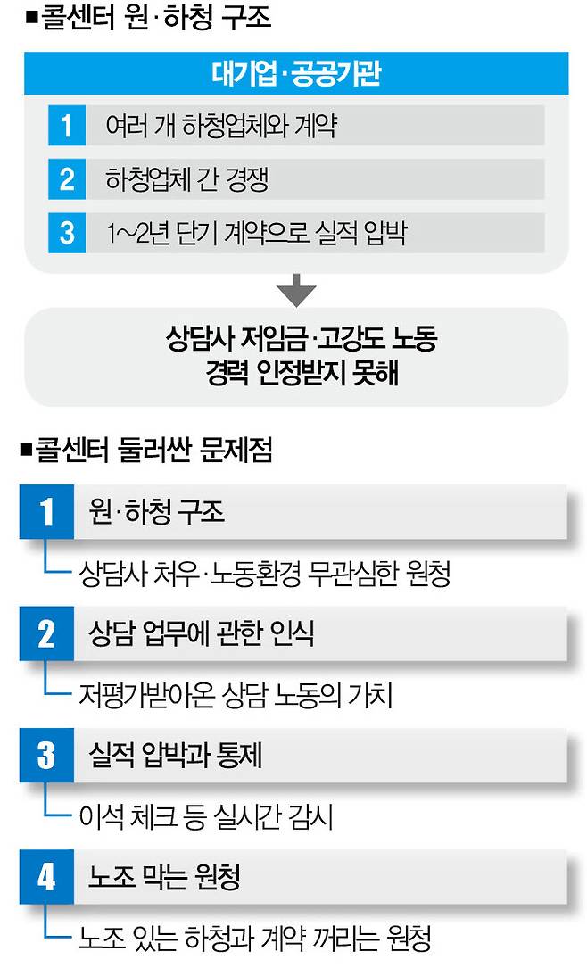 문제는 계약기간이 1년 안팎으로 짧은 데다, 원청이 비용 절감을 위해 최저가 업체와 계약을 맺는다는 점이다. 상황이 이렇다 보니 콜센터 상담사들의 급여는 늘 최저임금 수준에 머물고 노동환경도 나아질 기미를 보이지 않는다.