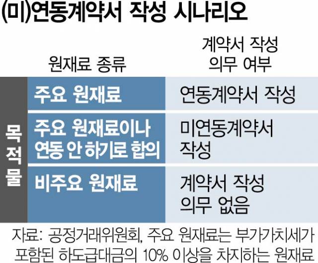 9일 공정위에 따르면 납품대금연동제 시행에 따른 계약서 작성이 반드시 필요한 원재료는 하도급거래에서 사용되는 ‘주요 원재료(부가가치세가 포함된 하도급대금의 10% 이상을 차지하는 원재료)’이다. 기준에 맞는 주요 원재료이고, 그 가격 변동분에 대금을 연동키로 했다면 ‘연동계약서’를 반드시 작성해야 한다. 주요 원재료는 있지만 대금을 연동하지 않기로 합의했다면 ‘미연동계약서’를 써야 한다. 다만 하도급법(상생협력법) 상 주요 원재료가 아닌 경우 계약서 작성에 대한 의무는 없다.
