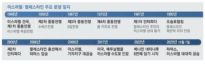 제5차 중동전쟁 발발에 대한 우려가 커지는 가운데 기존 이스라엘과 팔레스타인 간 분쟁 역사도 조명받고 있다. 1948년 발발한 제1차 중동전쟁은 이스라엘 건국과 동시에 이집트, 요르단, 시리아 등 5개국 아랍 연합군이 이스라엘을 공격하며 시작됐다.