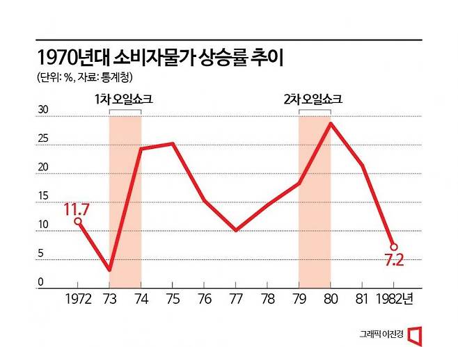 1979년 2차 오일쇼크 역시 한국 경제에 직격탄이 됐다. 2차 오일쇼크는 이란 혁명과 이듬해인 1980년 이란-이라크 전쟁에서 기인했다. 이란은 혁명으로 인한 파업으로 하루 600만 배럴의 석유 생산량을 200만 배럴까지 축소했다. 국제유가는 5개월 만에 15달러에서 39달러로 2.6배 상승했고, 이 여파로 국내 물가는 1980년 28.7%까지 뛰었다.
