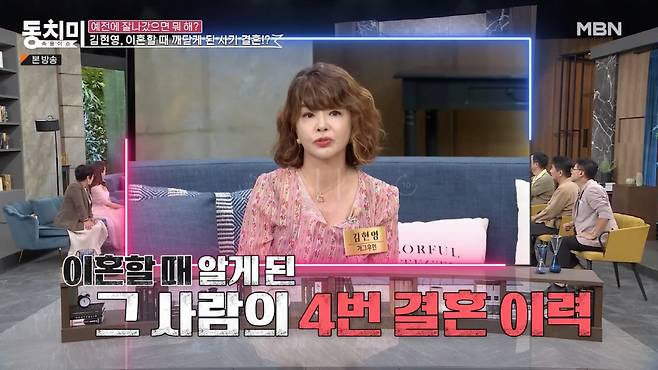 김현영은 7일 방송한 MBN '속풀이쇼 동치미'에 출연해 전남편과 이혼하게 된 이유를 털어놨다. 그는 "38세 정도 되니까 남들이 내가 못생겨서 시집을 못 갔다가 생각할 거 같아서 굉장히 위기를 느꼈다. 그러던 차에 비행기를 타고 가는데 옆에 있던 아주머니가 '결혼 안 했냐. 좋은 사람 있으니까 선 한번 볼 생각 있냐'고 하더라. 난 하늘에서 엮어주는 만남이라 되게 이상적인 만남이라고 생각했다. 그래서 행사가 있는 날 그 남자를 만나보기로 약속했다"고 전했다.