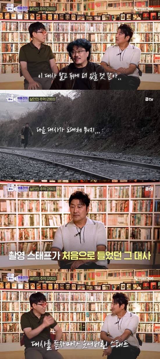 송강호는 '밥은 먹고 다니냐' 대사가 시나리오에는 없었다는 비화를 전했다. 그는 "그 대사는 봉준호 감독의 치밀함이 이루어 낸 것이다. 경남 사천 (죽봉 터널) 빈 철로에서 촬영했었다"라며 입을 열었다.