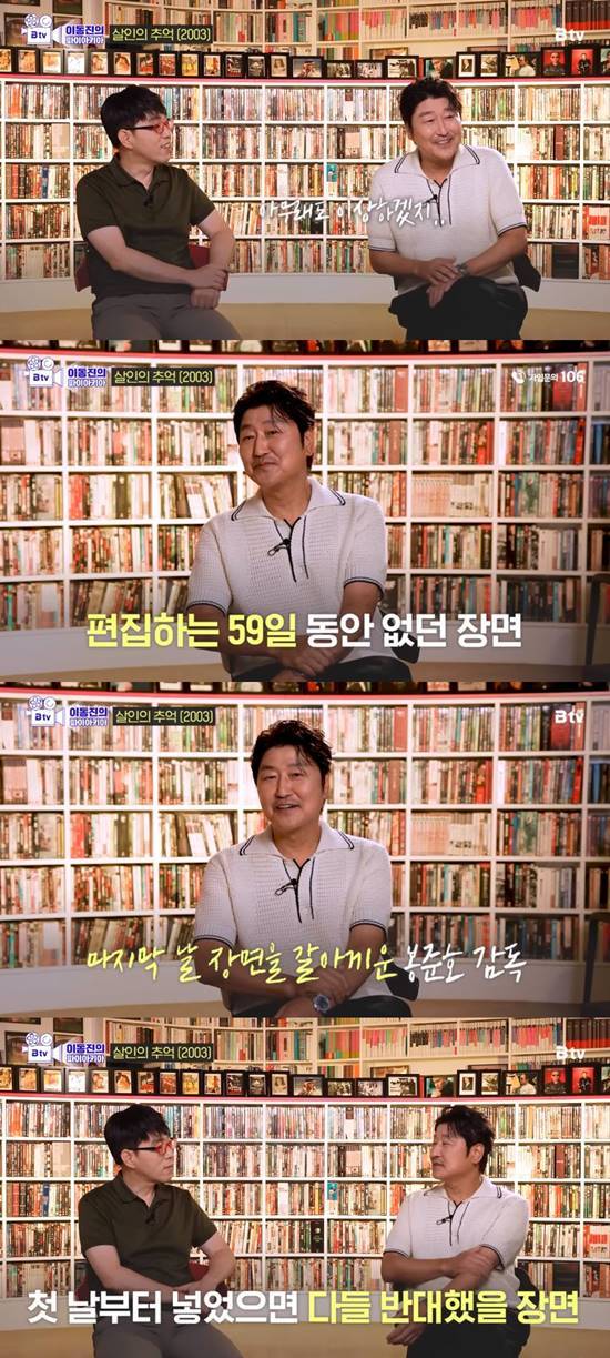 이에 이동진이 감탄하자, 송강호는 "아마 첫날부터 넣었으면 보시는 분들이 다 반대했을 거다. 말이 안 되는 대사가 나오냐고. 근데 그런 걸 염려하신 것 같다. 59일 동안 다른 버전이 걸려있다가 바꾸신 거다"라고 덧붙여 설명했다.
