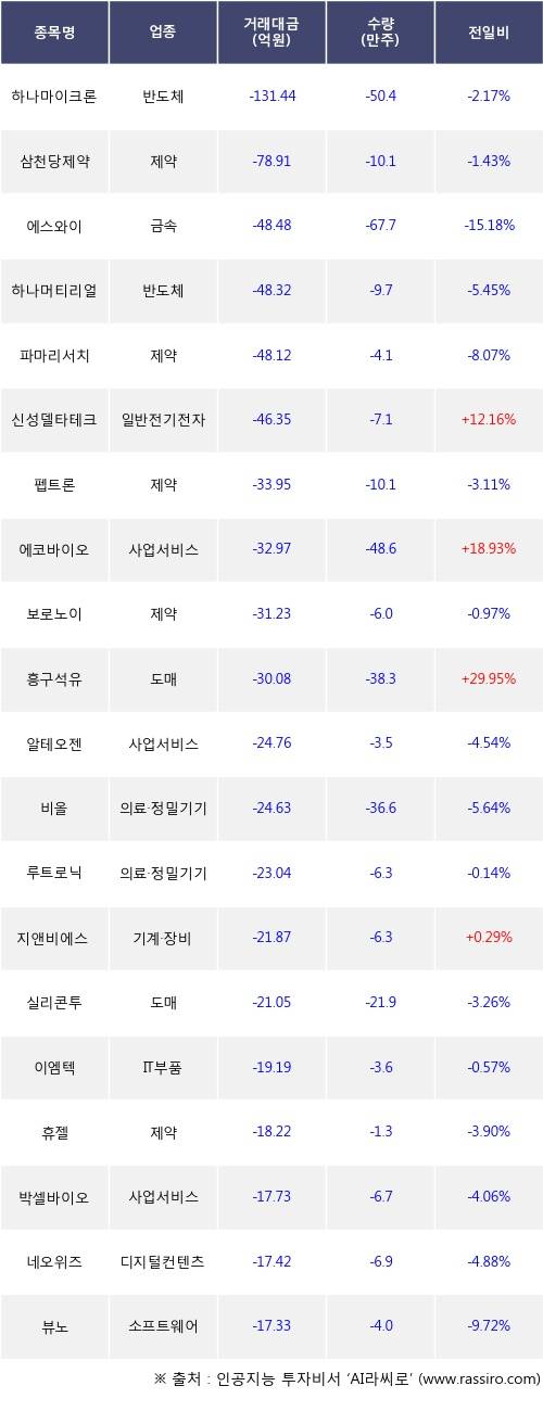 외국인 투자자의 순매도 상위 20개 종목은 하나마이크론, 삼천당제약, 에스와이, 하나머티리얼즈, 파마리서치, 신성델타테크, 펩트론, 에코바이오, 보로노이, 흥구석유등이다.