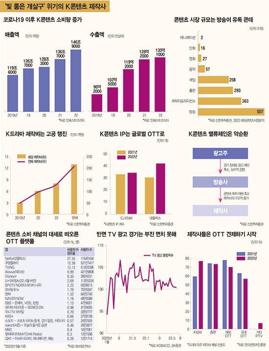 반면 한숨 푹푹 쉬는 곳도 있다. 드라마 제작사다. 제작비를 통째로 받아 돈 걱정 없이 제작하기는 했지만 ‘빛 좋은 개살구’인 격이 많아서다. 아무리 잘 만들어 흥행 대박이 났다 해도 IP(지식재산권)가 없으니 생긴 현상이다. 영화 시장 역시 OTT 득세로 극장가 히트작을 찾기 어렵다. 이러다 ‘콘텐츠 종주국’에서 ‘OTT 식민지’로 전락하는 것 아니냐는 우려가 그 어느 때보다 높다. 대내외 우려에 휩싸인 K콘텐츠 제작 시장을 점검해본 배경이다.