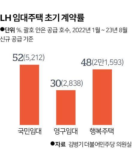 10일 한국일보가 김병기 더불어민주당 의원실을 통해 확보한 자료에 따르면, 지난해부터 올해 8월까지 입주자를 모집한 행복주택 2만1,593가구의 평균 계약률은 48%(1만377가구)로 집계됐다. 청약 당첨자의 절반 이상이 계약을 포기했다는 뜻이다. 행복주택은 가장 최근 선보인 신식 임대아파트인데도 같은 기간 5,200여 가구가 공급된 국민임대(계약률 52%)보다 계약률이 낮다.