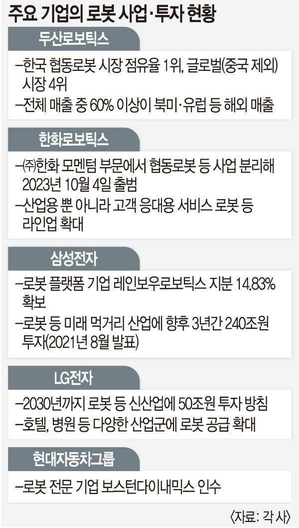 삼성전자와 LG전자도 천문학적 돈을 투자하며 ‘로봇 전쟁’에 뛰어들었다. 레인보우로보틱스 지분 14.83%를 보유해 2대 주주에 오른 삼성전자는 웨어러블 로봇 등의 출시를 준비 중이다. 이재용 삼성전자 회장은 2021년 8월 로봇 등의 미래 먹거리 산업에 3년간 240조원을 쏟아붓는다는 구상을 내놓기도 했다. LG전자 역시 2030년까지 로봇 등 신산업에 50조원을 투입할 계획이다. 로봇 전문기업 보스턴다이내믹스를 인수한 현대자동차그룹은 로봇개 등을 선보이며 기술 주도권 확보에 팔을 걷어붙였다.