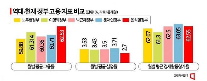 11일 아시아경제가 통계청의 고용지표를 바탕으로 노무현, 이명박, 박근혜, 문재인, 윤석열 정부의 집권 기간 월별 고용률 평균(각 정부의 집권 달이 겹치는 시기는 중복 계산)을 산출한 결과, 역대 정부 중 윤석열 정부가 들어선 이후 평균 고용률이 62.53%로 가장 높았다. 이명박 정부(61.3%), 박근혜 정부(60.36%)의 평균 고용률은 그 뒤를 이었다. 문재인 정부는 60.71%, 노무현 정부는 59.88%에 그쳤다.