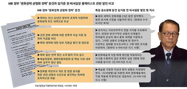 김기춘 전 실장 특검 수사와 재판 과정에서 드러난 박근혜 정부 시절 블랙리스트 작업과 판박이인 내용들이 2008년 문건에 적혀 있다. 두 정부에 걸쳐 기획되고 집행된 블랙리스트는 규모와 강도에 차이가 있을 뿐, 아이디어와 목적, 대안 및 후속 조치 모두 한줄기로 이뤄져 있는 것으로 보인다(〈그림〉 참조).