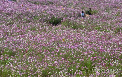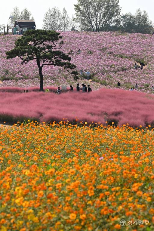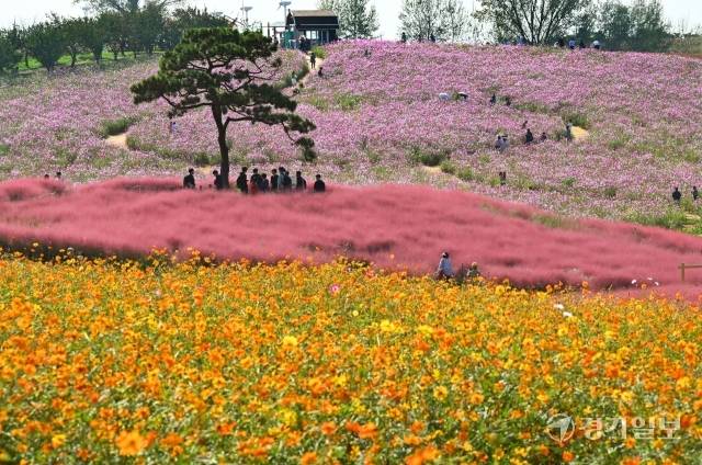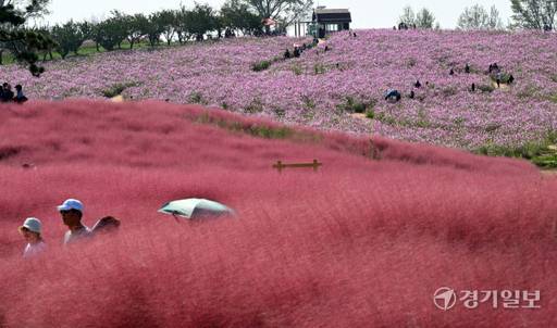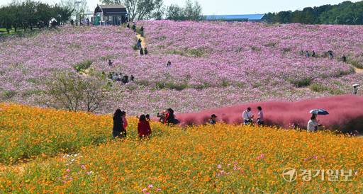 청명한 날씨를 보인 12일 오후 '코스목동 축제'가 한창인 안성팜랜드에서 시민들이 활짝 핀 핑크뮬리, 코스모스 등을 감상하며 가을 정취를 만끽하고 있다.