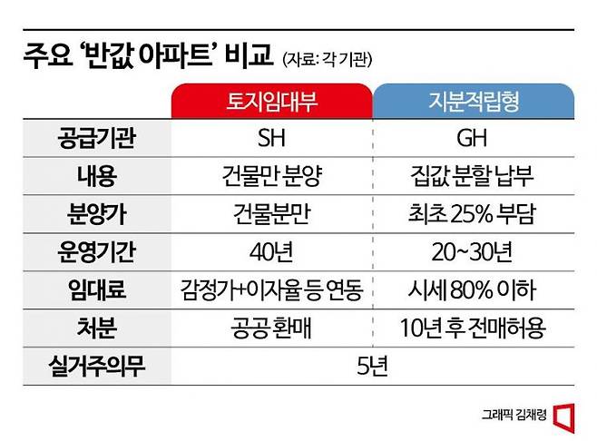 민간 아파트 분양가가 천정부지로 치솟으면서 공공에서 공급하는 토지임대부, 지분적립형 분양주택 등 이른바 ‘반값 아파트’에 관심이 쏠리고 있다. 전문가들은 주거 안정과 자산증식 수단의 측면에서 각 주택의 장단점을 따져보고 청약에 나설 것을 조언했다.