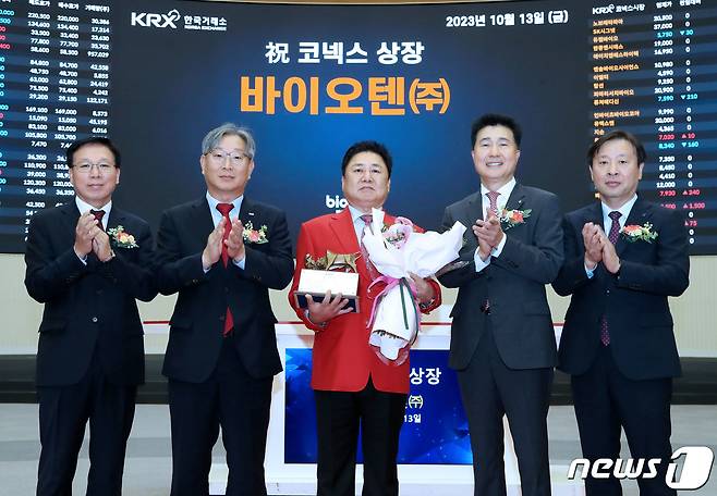 (서울=뉴스1) = 13일 오전 서울 영등포구 한국거래소에서 열린 바이오텐 코넥스시장 상장기념식에서 상장기념패 전달 후 지천삼 코넥스협회 부회장(왼쪽부터), 홍순욱 한국거래소 코스닥시장본부장, 김영철 바이오텐 대표이사, 감성한 IBK투자증권 부사장, 유도석 한국IR협의회 상무가 기념촬영을 하고 있다. (한국거래소 제공) 2023.10.13/뉴스1