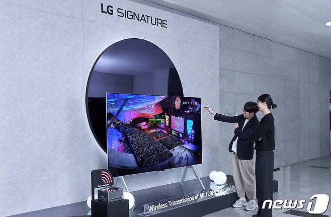 시상식이 열린 부산 'KNN 시어터'에서 방문객들이 세계 최초 무선 올레드 TV인 'LG 시그니처 올레드 M'을 살펴보고 있다. (LG전자 제공) 2023.10.13/뉴스1