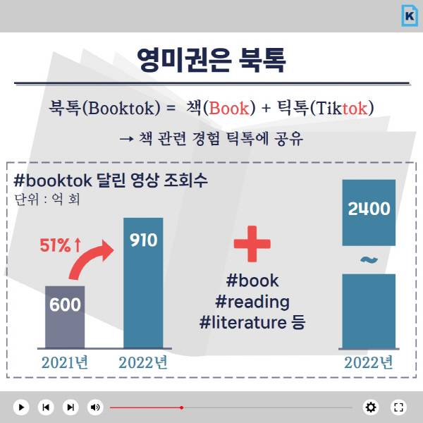 지난해 #booktok 해시태그가 달린 틱톡 영상의 조회수는 총 910억 회를 상회해 전년도 조회수 600억 회보다 51% 넘게 증가했다. #reading, #book, #literature 등 연관 해시태그까지 함하면 전체 조회수는 2400억 회다.