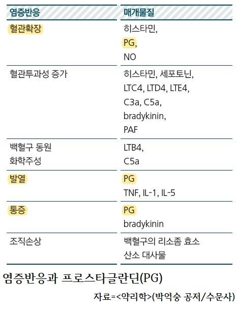 ‘프로스타글란딘(PG)’은 대표적인 염증 매개체로 많은 증상의 원인이 된다. 주로 혈관 확장, 혈소판 응집 방해, 투과성 증가에 따른 부종 형성 등 작용이 일어난다. 그리고 ‘통증과 열’ 등 전신증상의 원인이 되기도 한다. 프로스타글란딘은 아라키돈산에서 시클로옥시게나아제(COX) 작용으로 만들어진다. 대부분 해열 진통제는 통증 매개 물질 억제, 시클로옥시게나아제 억제로 해열, 진통 그리고 염증을 줄이는 효과(소염 효과)를 나타낸다.