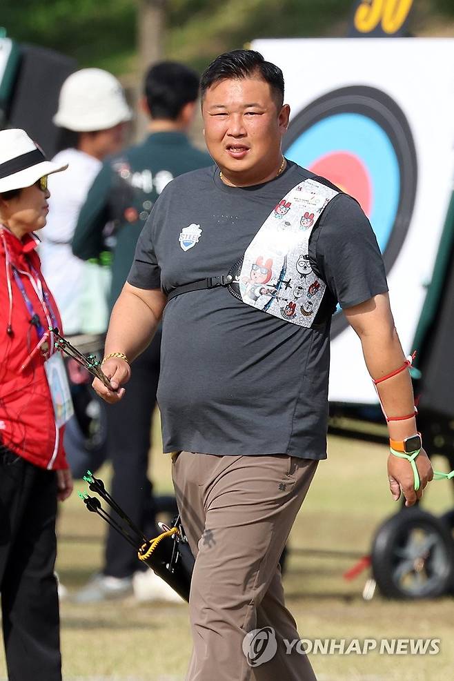 (광주=연합뉴스) 정회성 기자 = 14일 오전 광주 국제양궁장에서 열린 제104회 전국체육대회 양궁 리커브 남자일반부 90m 예선 경기에서 오진혁(현대제철)이 표적지를 확인한 뒤 사대로 돌아가고 있다. 2023.10.14