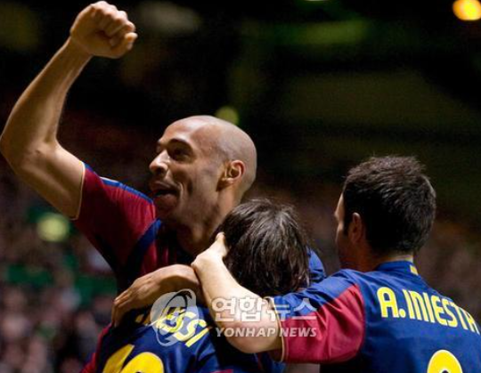 바르셀로나에선 달랐다. 2007/08시즌 47경기 19골, 2008/09 시즌에는 42경기 26골을 집어넣는 등 아스널에서 보여주던 기록을 그대로 스페인까지 끌고올 순 없었다. 물론 훌륭한 기록이었으나 아스널 만큼은 아니었다. 그러나 앙리는 불만이 없다. 메시와 바르셀로나 덕분에 염원했던 '빅이어'를 커리어에 추가할 수 있었기 때문이다.