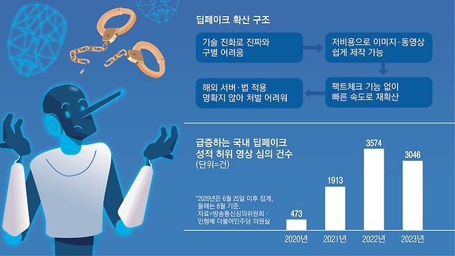 이와관련 국회 과학기술정보방송통신위원회 소속 더불어민주당 민형배 의원이 방송통신심의위원회로부터 제출받은 자료에 따르면, 딥페이크 기술을 활용한 음란물 적발 건수는 최근 3년 2개월간 9000건에 달했다. 심의 건수는 폭증하고 있다. 2020년 473건에 그쳤지만, 올들어 누적 3046건에 달했다. 하지만 처벌은 5% 수준이었다. 해당 영상을 제공하는 사이트 상당수가 서버를 해외에 두고 있는 점이 주된 이유로 꼽혔다. 이상덕 송경은 황순민 기자