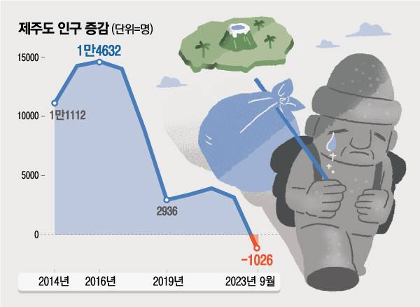 13일 제주특별자치도에 따르면 올해 1월부터 들어오는 인구(전입)보다 나가는 인구(전출)가 많아진 제주는 9월까지 총 1026명의 순유출을 보이고 있다. 주민등록인구도 올해 9월 기준 67만6317명으로 지난해 말(67만8159명)과 비교해 1842명 줄었다.
