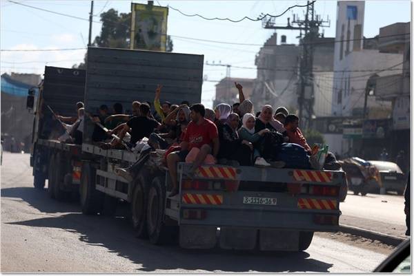 | ▲ 이스라엘 폭격기의 표적이 되자 가자지구 남쪽 지역으로 피난을 떠나는 사람들. 2023년 10월 14일. |