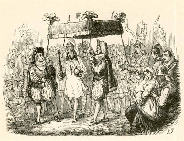 | ▲ 안데르센의 ‘벌거벗은 임금님’ 삽화. 그림은 빌헬름 페데르센. 원제목은 [황제의 새 옷] (Kejserens nye Klæder, 1837)인데, 일본 출판명인 벌거숭이 임금님(はだかの王?)이 수입되면서 ‘벌거벗은 임금님’으로 굳어졌다. |