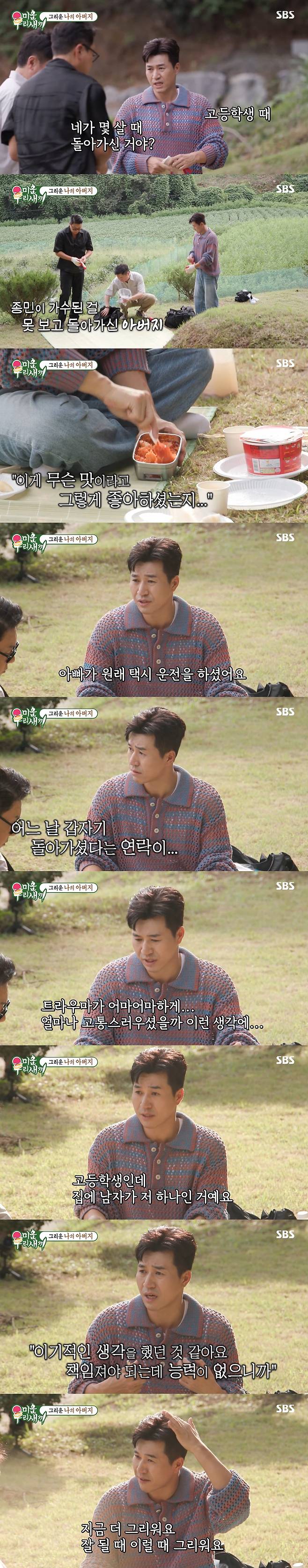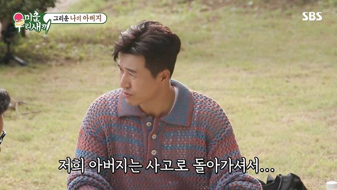 김종민은 "저희 아버지는 사고로 돌아가셨다"며 "택시 운전을 하셨다. 운전하다 몸이 안 좋아지셔서 횟집을 하신다고 했는데 어느 날 갑자기 돌아가셨다고 연락이 왔다"며 그날을 떠올렸다.