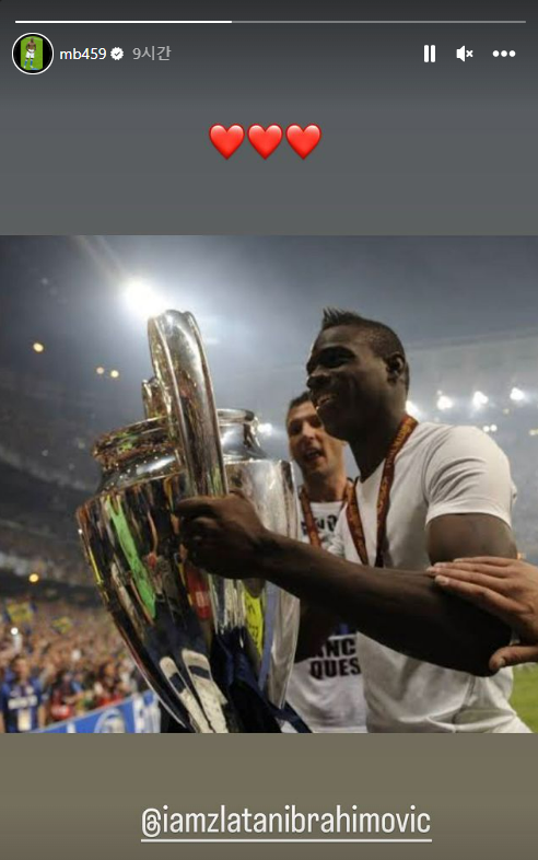발로텔리는 16일 자신의 소셜미디어(SNS)에 유럽축구연맹(UEFA) 챔피언스리그(UCL) 우승 당시 사진을 게시했다. 2009-10시즌에 인터 밀란 소속으로 챔피언스리그 우승을 차지했을 때 모습이다.