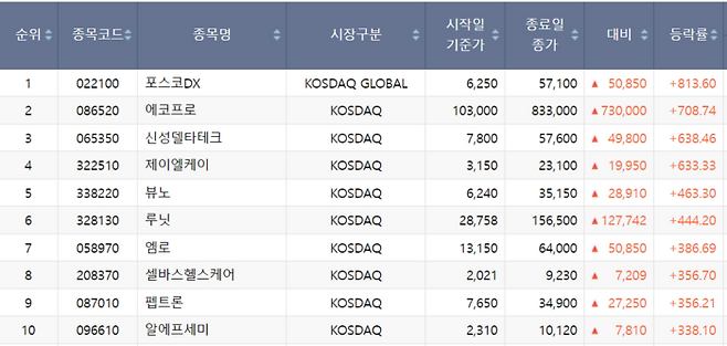16일 한국거래소에 따르면 올해 코스닥 주가 상승 톱 10위 기업은 △포스코DX △에코프로 △신성델타테크 △제이엘케이 △뷰노 △루닛 △엠로 △셀바스헬스케어 △ 펩트론 △ 알에프세미 순이다.