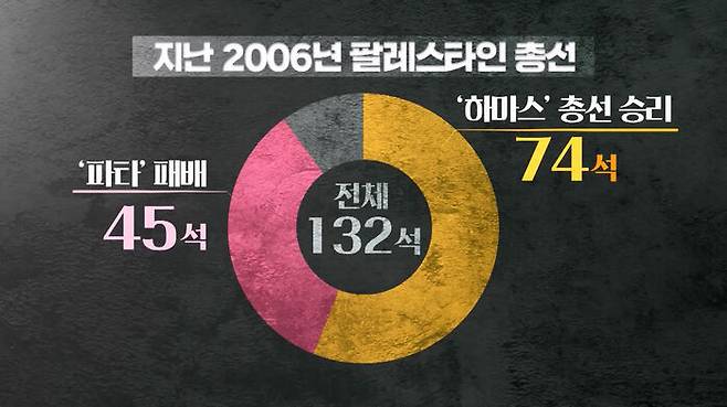 당시 총선에서 하마스는 전체 132석 중에 74석을 얻어서, 당시 45석에 그쳤던 파타를 제치고 1당이 됐고, 자체적으로 총리로 선출했는데요. 이렇게 하마스가 주도하는 내각에 정작 파타가 참여하길 거부하면서, 이 사태는 양측 간 무력충돌로 이어지기까지 했습니다.