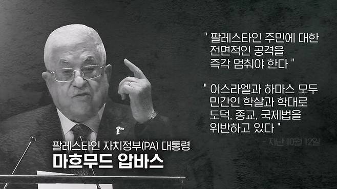 이런 하마스에 대해서 팔레스타인 자치정부(PA)의 마흐무드 압바스 대통령, 뒤늦게 개전 닷새만인 지난 12일에 이스라엘의 보복 공격을 비판하면서 동시에 하마스도 함께 비난했습니다.
