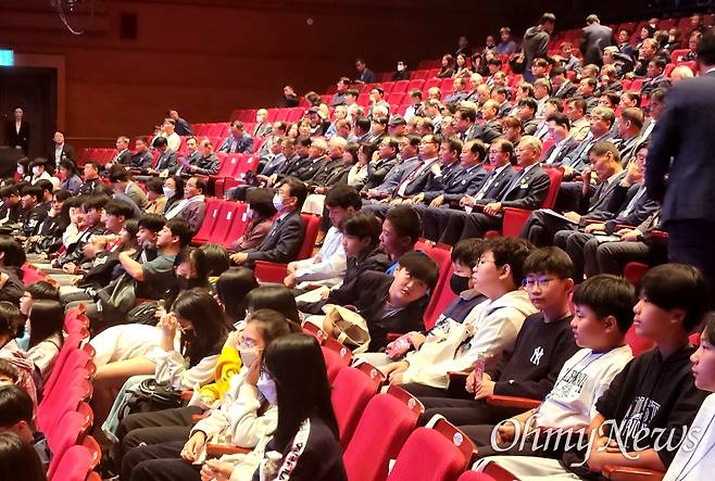 16일 오전 창원마산 3·15아트센터 대극장에서 열린 "제44주년 부마민주항쟁 기념식"에서 고기동 행정안전부 차관이 윤석열 대통령의 기념사를 대독하는 동안 객석에서 일부 참석자들이 이같이 고함을 질렀다.