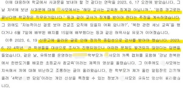 이어 B교사는 "(6월 17일 교장의) 사과문에 대해 A사모에서는 '해당 교사는 교육청 징계감 아닙니까' '엄중 경고로만 끝난다면 학교장은 직무유기입니다' 등과 같이 교사가 징계를 받아야 한다는 주장을 계속했다"면서 "그 외에도 '전교조 요직에 있을지 어찌 압니까?' '북한 관련 세뇌 교육'을 했다 등과 같은 허위사실 유포가 이어졌다"고 전했다. "개인 신상을 특정할 수 있는 정보가 A사모와 유튜브 영상에 올라왔다. 교사 개인을 공격하고 비방했다"고도 강조했다.