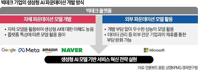 오픈AI와 같이 AI 분야에 집중하는 스타트업이 놀라운 기술력을 선보이기도 했지만, 생성형 AI를 통한 혁신을 도모하는 기업 중 상당수는 빅테크 플랫폼 기업이다. 마이크로소프트(MS), 구글 등의 해외 빅테크 플랫폼 기업과 네이버, 카카오 등의 국내 빅테크 플랫폼 기업은 생성형 AI 기능을 자사의 서비스 모델과 융합해 서비스 혁신을 가져오기 위한 노력을 지속하고 있다.