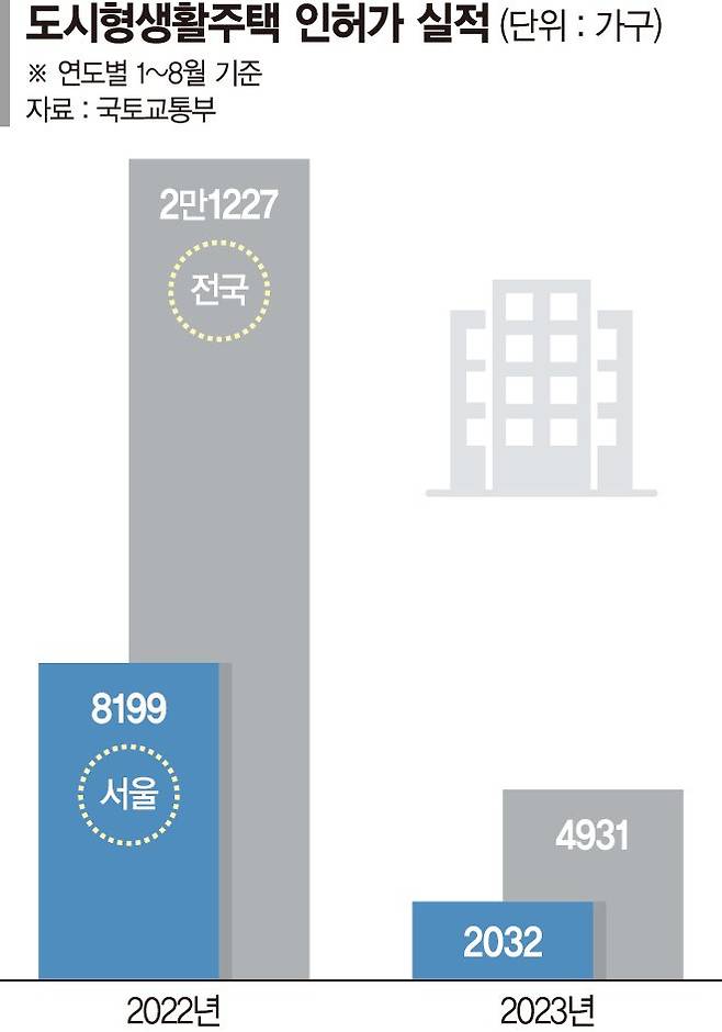 인허가 물량 감소세도 멈추지 않고 있다. 국토교통부 자료에 따르면 올 1월부터 8월까지 전국 도시형생활주택 인허가 물량은 4931가구에 불과하다. 지난해 같은 기간(2만1227가구)에 비해 76% 감소했다. 같은기간 서울 인허가 물량도 8199가구에서 2032가구로 75% 줄었다.