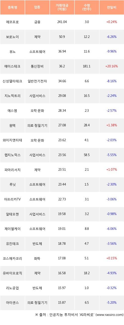 외국인 투자자의 순매수 상위 20개 종목은 에코프로, 보로노이, 뷰노, 에이스테크, 신성델타테크, 지노믹트리, 에스엠, 원텍, 와이지엔터테인먼트, 랩지노믹스등이다.