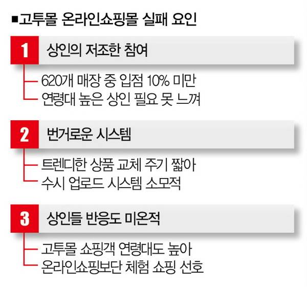 그럼에도 고투몰 관계자는 "열심히 상인들을 설득 중이고, 많은 상인들이 뜻을 모은다면 성공적인 사례를 만들 수 있을 것"이라는 기대감으로 사업을 밀어붙였다. 그로부터 3년이 흐른 지금, 고투몰의 온라인쇼핑몰 사업은 어떻게 됐을까. 결론부터 말하면 성공보단 실패 쪽에 가깝다. 그 이유를 하나씩 짚어보자.