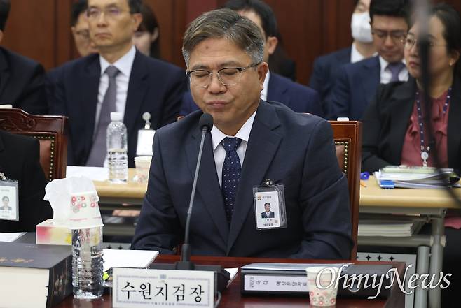 | ▲ 신봉수 수원지검장이 17일 오전 서울 서초구 서울고등검찰청에서 열린 법제사법위원회의 서울고등검찰청, 서울중앙지검, 수원지검 등에 대한 국정감사에서 이재명 대표 수사를 맡은 이정섭 수원지검 2차장검사의 위장 전입과 김영란법 위반 의혹 등을 제기하는 김의겸 더불어민주당 의원의 질의에 난감한 표정을 짓고 있다. |