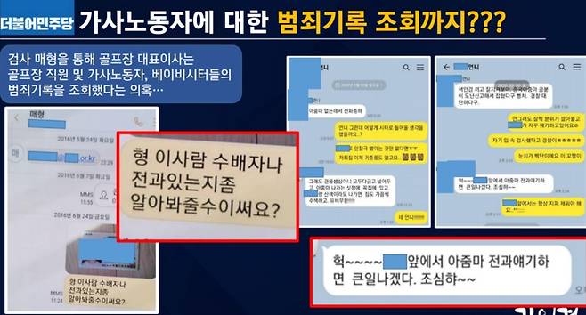 또한 처남이 이 차장에게 가사노동자 등에 대한 범죄기록을 조회해달라고 하는 내용과, 이 차장이 처남에게 검사들의 골프장 예약 편의를 부탁하는 내용의 텔레그램 메시지도 공개됐다. 처남이 이 차장에게 운전면허증 사진을 보내면서 "형, 이 사람 수배자나 전과 있는지 좀 알아봐 줄 수 있어?"라고 요청하는 화면이 제시됐다.